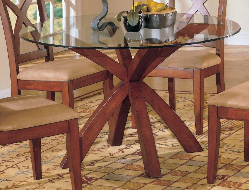 Для стеклянного стола с деревянным подстольем подходят деревянные стулья классического стиля. Данный комплект будет прекрасно сочетаться.