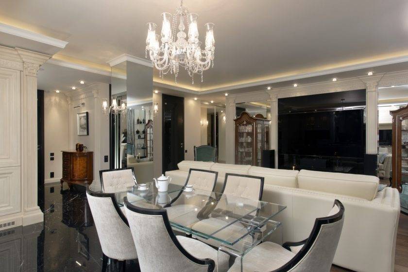 Плавные линии в интерьере ассоциируются с теплой семейной атмосферой или дружескими посиделками. Столы с круглой столешницей идеально подходят для квадратных помещений. По сравнению с квадратным столом, круглый вмещает большее количество человек. Закругленные углы делают мебель безопасной для детей. На фото слева круглый стол на современной кухне, на фото справа – прозрачная мебель в неоклассическом интерьере.
