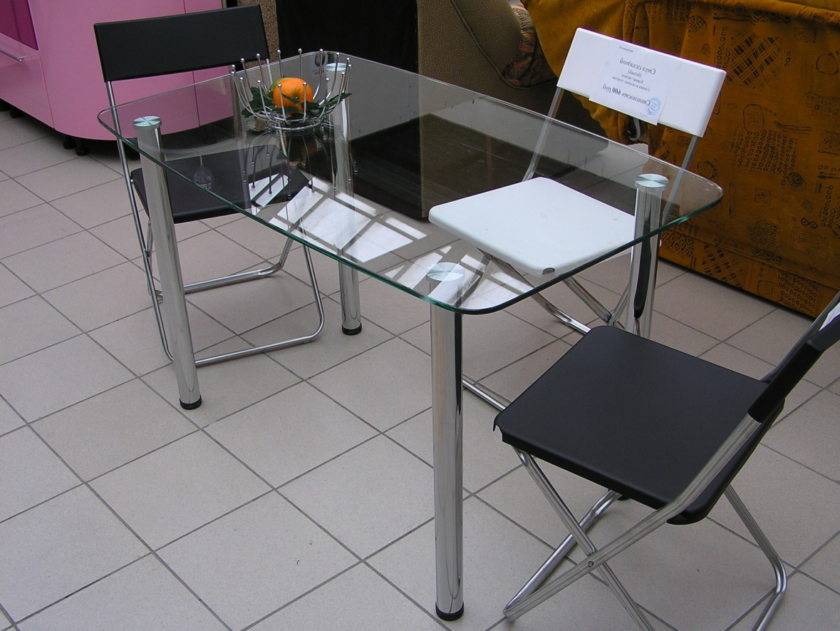В основном для маленьких помещений используют прямоугольные стеклянные столы, которые можно прислонить одной стороной к стене.