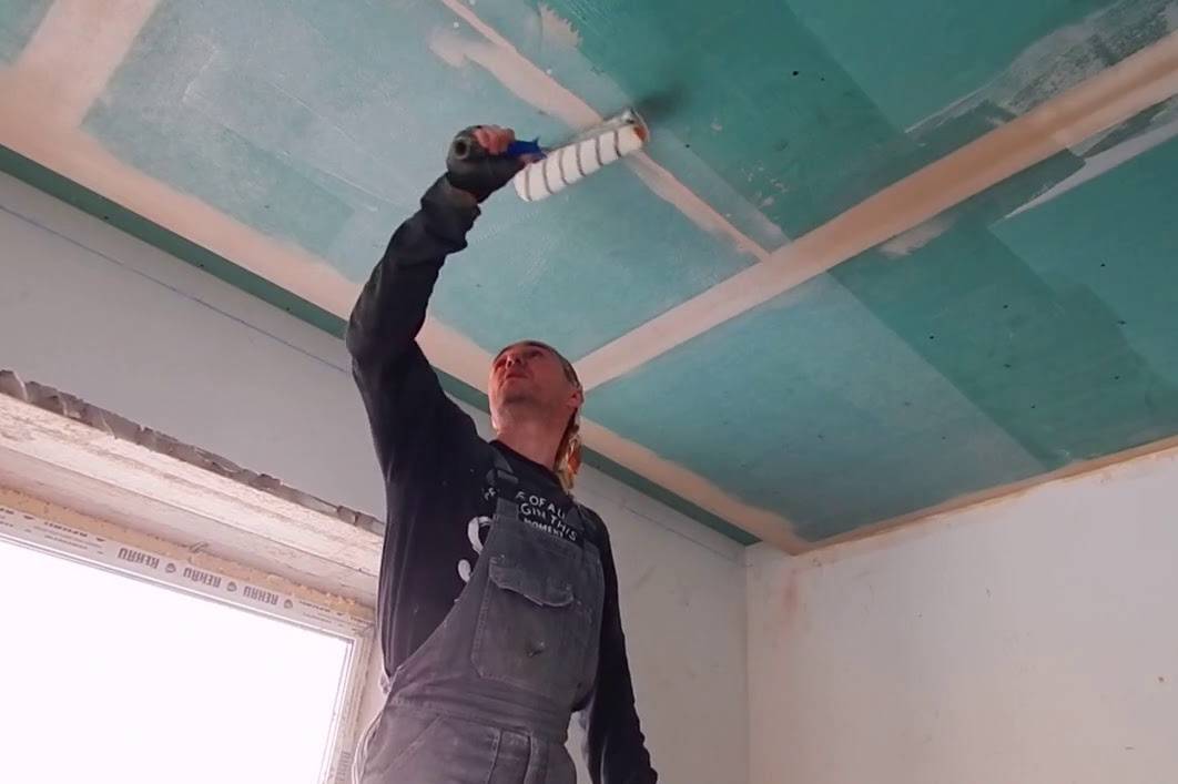 Предварительно зашпаклевывают места над саморезами и швы между соседними плитами, а затем весь потолок.