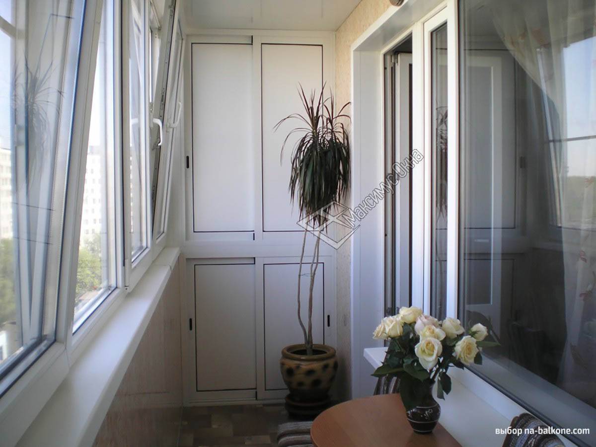 - Встроенный шкаф для балкона с полками и дверцами. Создает комфортную обстановку благодаря возможности скрыть уложенные внутри предметы.