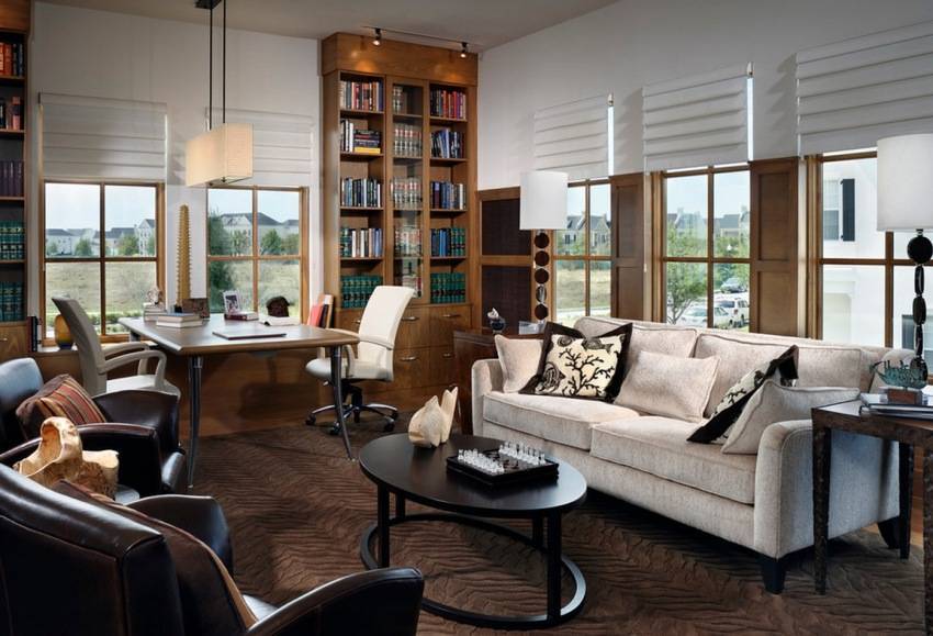 Достаточно популярными считаются комбинированные изделия со встроенным камином или рабочей зоной с выкатным, выдвижным письменным или компьютерным столом, который может использоваться только в случае необходимости. Такое решение особенно уместно для зала, имеющего скромную площадь.
