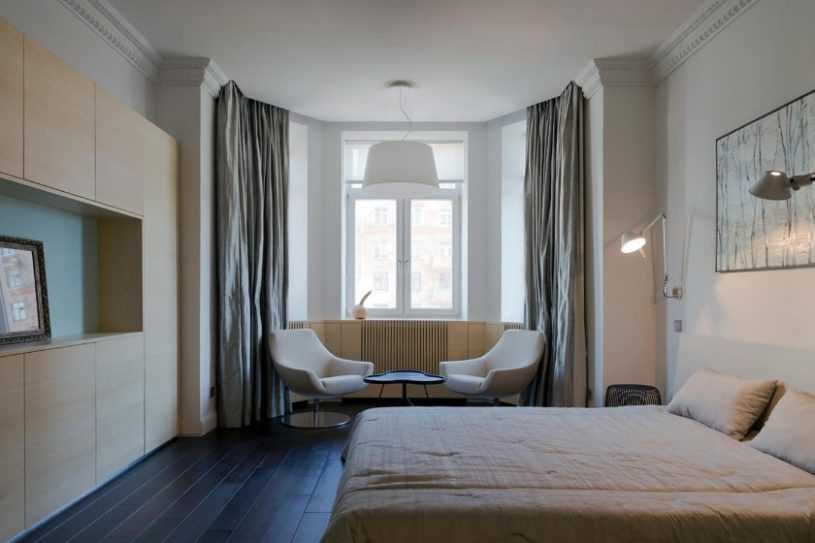 Альков, со встроенными и вместительными шкафами, с фасадом по цвету совпадающем со стеновой отделкой, создает отдельную уединенную зону и исключает лишние элементы из интерьера.