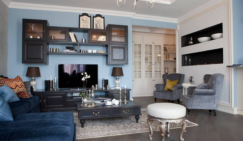 Наличие стенки в гостиной делает ее уютнее и подчеркивает стиль интерьера