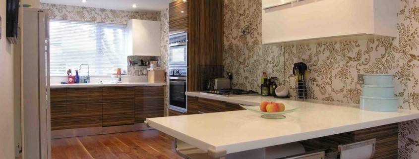 На данном этапе производится окончательная отделка помещения. Работы начинаются с потолка. Там на каркасе или без него крепится выбранный материал (пластик, пенополистирольная плитка), либо специалистами выполняется установка натяжного потолка. Стены подвергаются грунтованию, покраске, побелке, нанесению декоративной штукатурки. Либо производится поклейка обоев. Одним из выбранных материалов отделывается кухонный фартук.