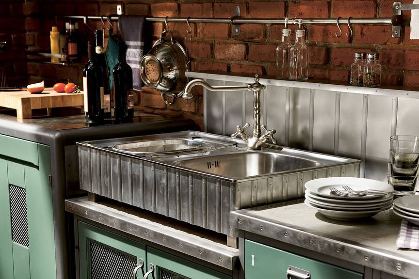 Бытовую технику обычно выбирают серых расцветок или оттенка металлик. Дополняют ее стильной вытяжкой, медными тазами, чугунными сковородами, бронзовыми ступками, фурнитурными элементами из латуни на шкафчиках.