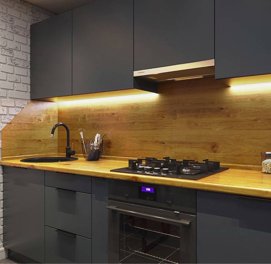 Столешницы для кухонь в стиле лофт чаще всего делают из разнообразных пиломатериалов. В ход пускают фанеру, слэбы, доски.