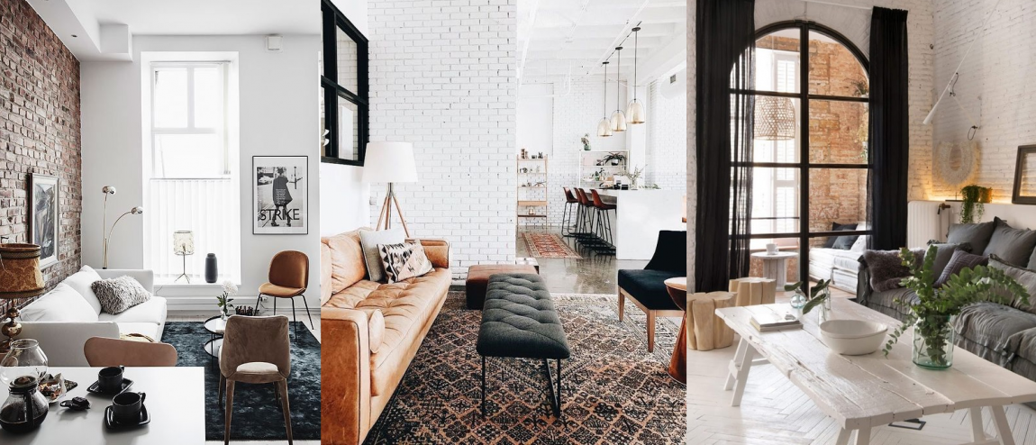 - неотделанные кирпичные стены или имитация кирпичной (иногда каменной) кладки;