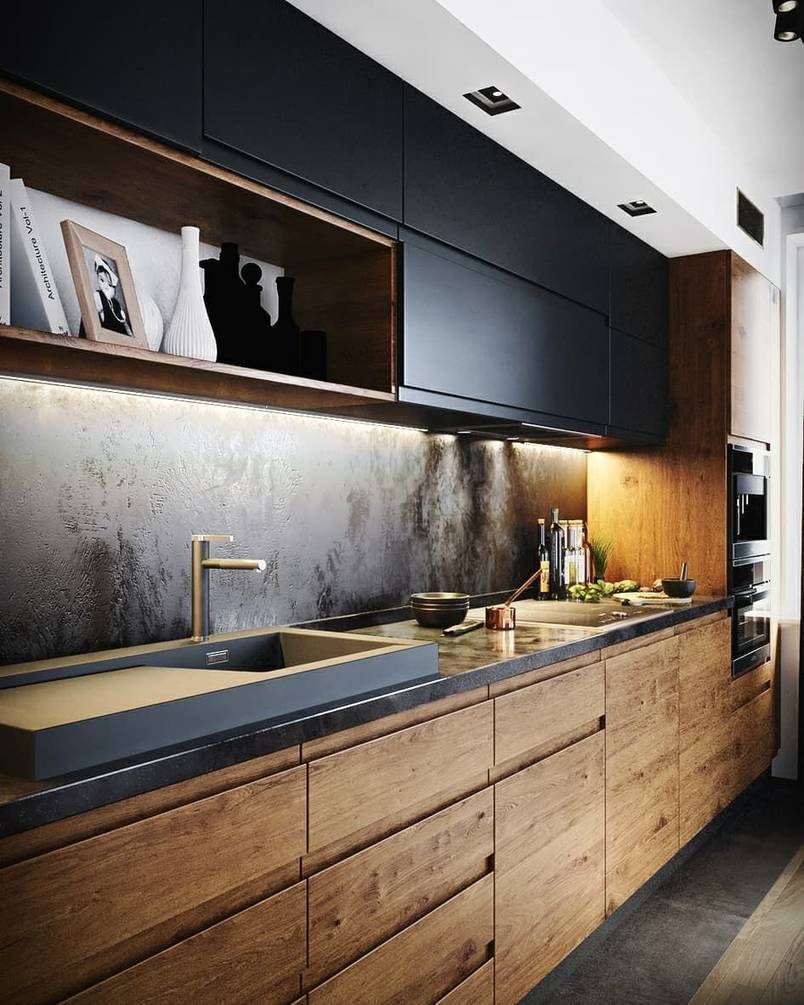 Для кухонных интерьеров в лофт стилистике мебель часто делают на заказ или по индивидуальным параметрам. Фасады могут быть деревянными, шпонированными, выполненными из МДФ. Покрытыми пленкой либо эмалью. Ручки на ящиках должны быть лаконичными или вообще отсутствовать.