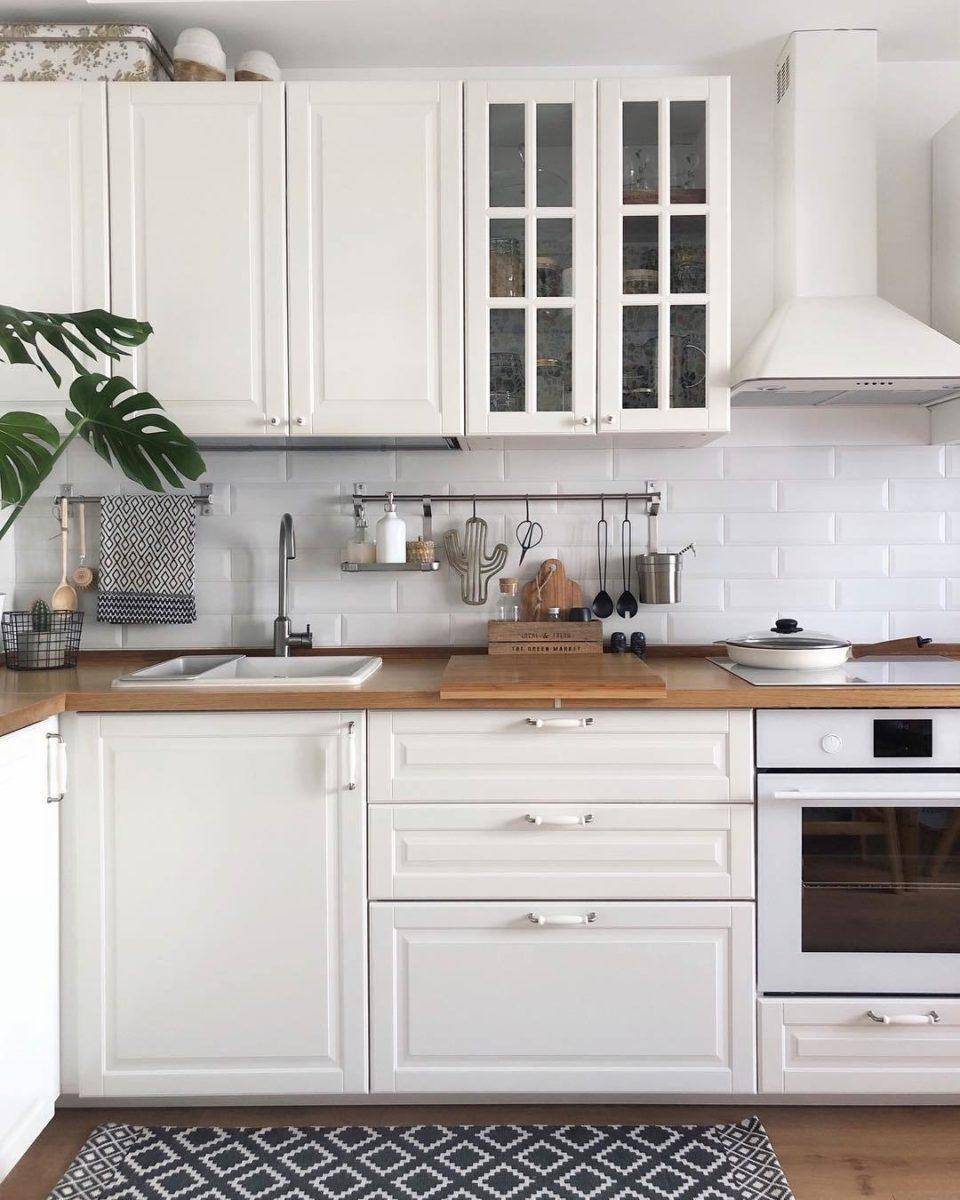 Белый цвет можно использовать в качестве основного или дополнительного. Его можно добавлять в любые элементы – фартук, стены, мебель, декор. Это базовый цвет, который сочетается с любым другим из цветового круга и всегда выручит, когда необходимо сбалансировать слишком темный или слишком яркий интерьер.