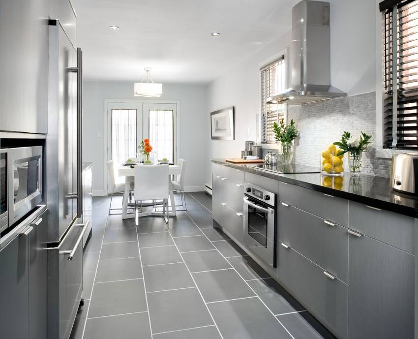 Если кухня маленькая, выбирайте светло-серые оттенки. В больших пространствах можно экспериментировать с темными тонами при условии, что помещение имеет достаточную естественную освещенность.