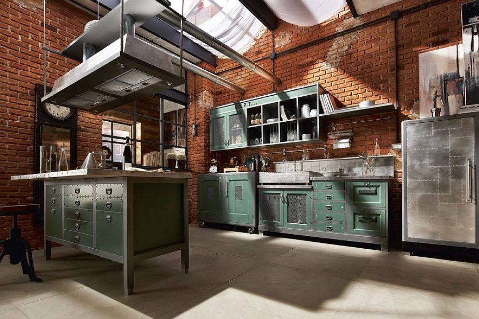 Зеленая кухня в стиле лофт