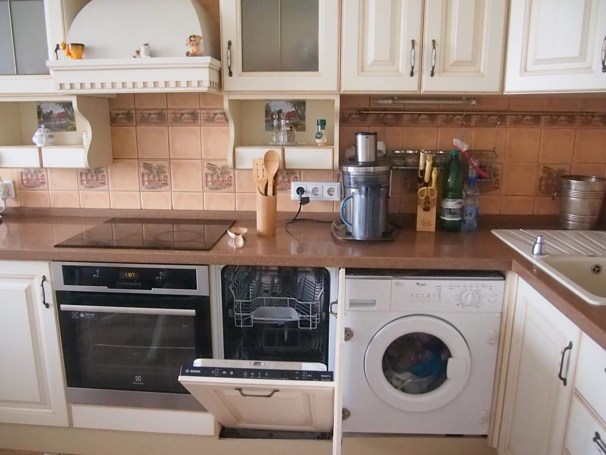 размещение на кухне освобождает пространство в ванной, что особенно важно, если она маленькая; размещение рядом с кухонной мойкой облегчает подключение агрегата к коммуникациям для набора и слива воды; легче разместить машину большого размера; прибор легко спрятать за кухонными фасадами так, что его вообще не будет видно. Недостатки: