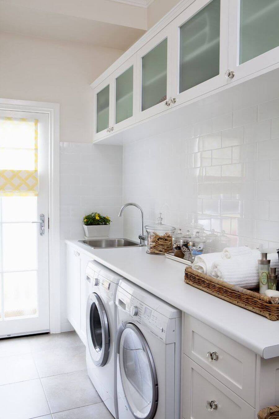 Столешница может быть небольшой, накрывать только мойку и имеющуюся рядом стиральную машину. Под мойкой удобно расположить полки для хранения бытовой химии (моющие средства, стиральный порошок, пасты для очистки раковин, средство для прочистки сливных труб).