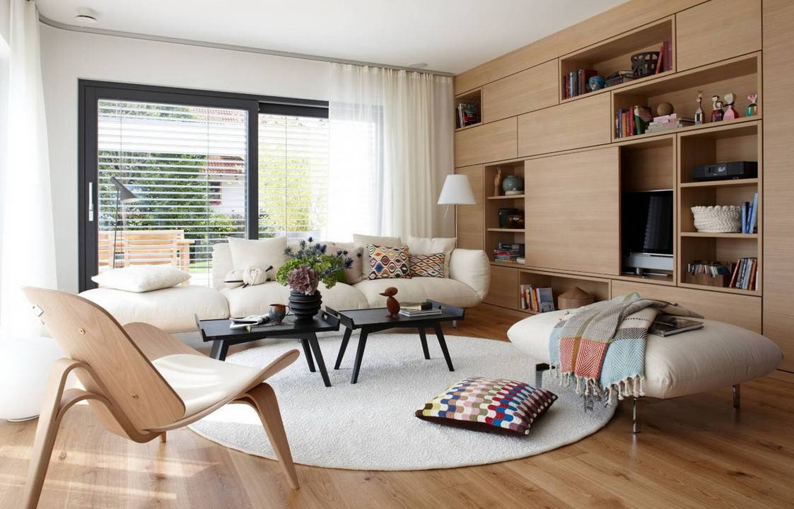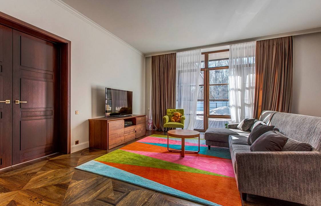 - Наличие ковра способствует созданию особой атмосферы в помещении. Мягкий ковер вызывает желание походить босиком, дает возможность поиграть с ребенком на полу, посмотреть любимое кино среди разноцветных подушек, сброшенных на пол.