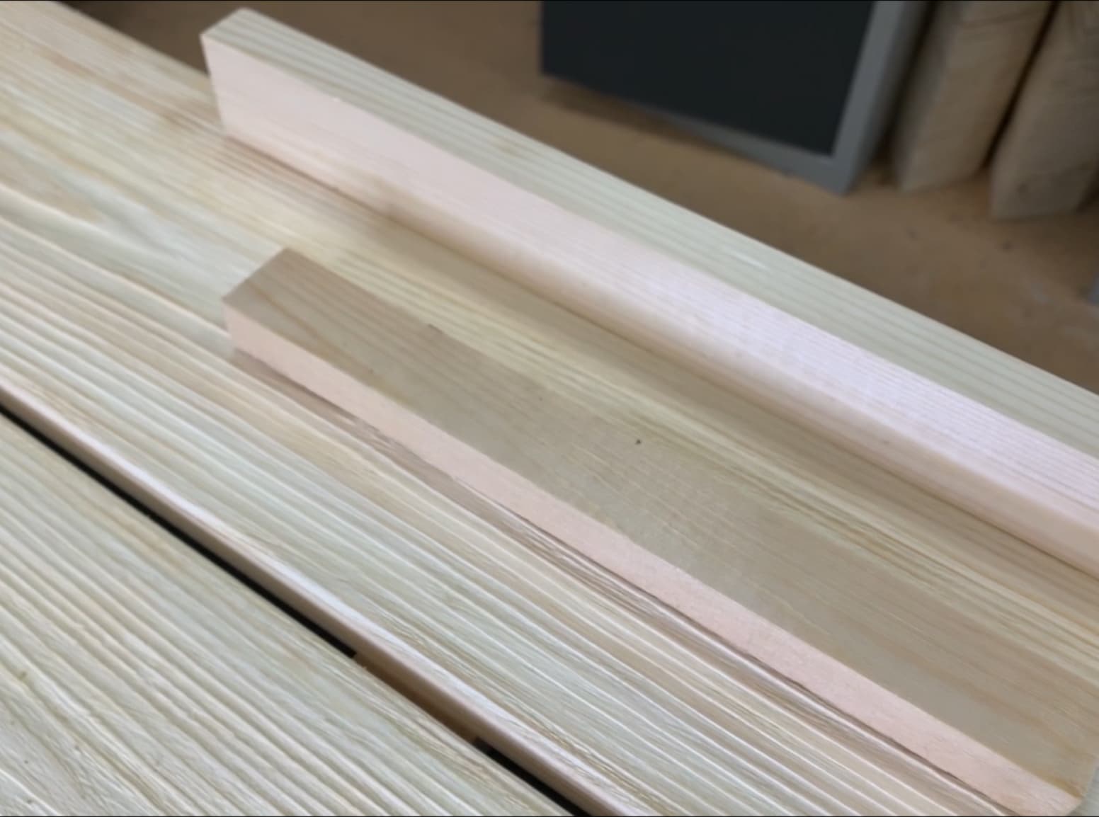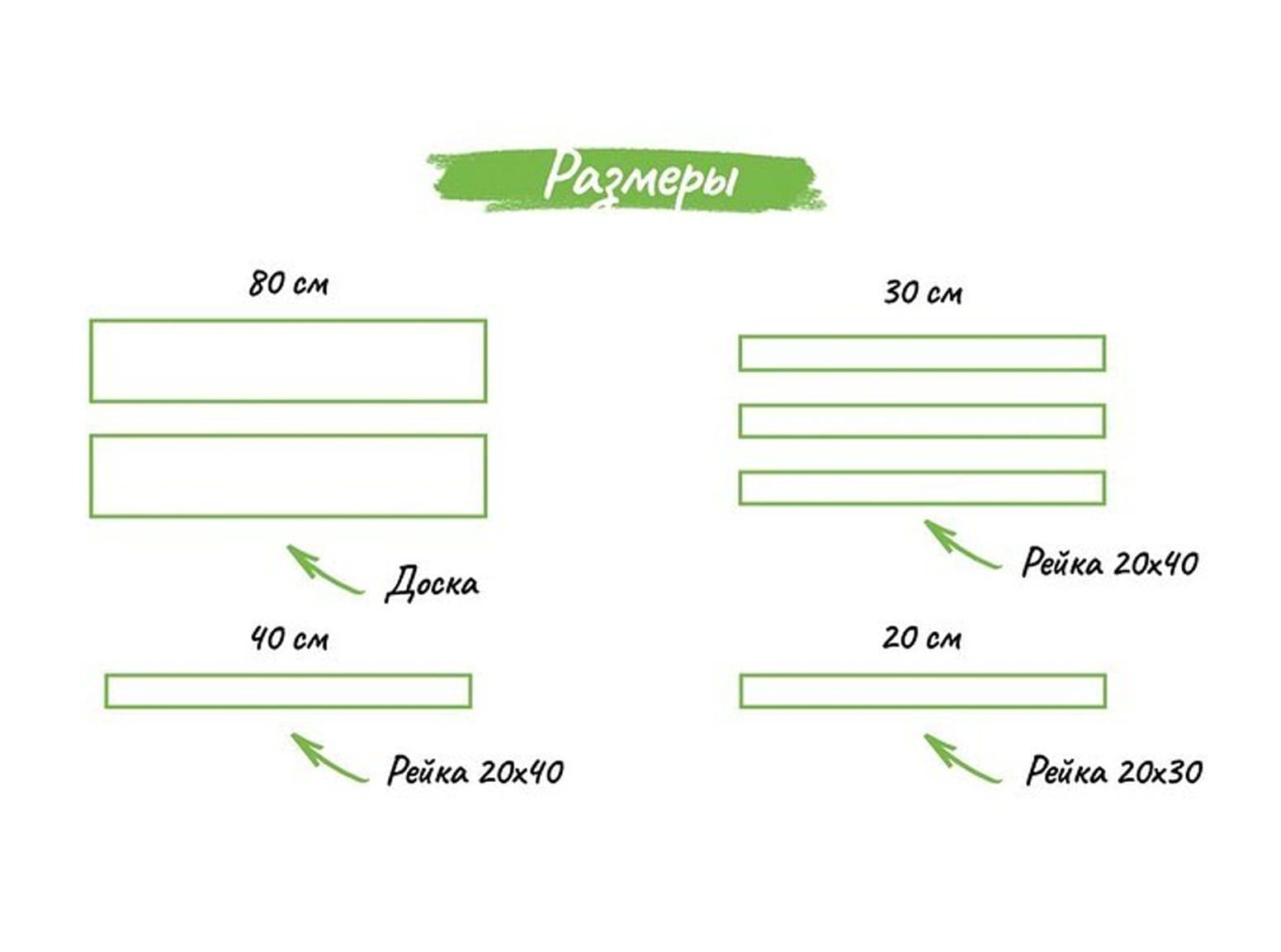 Сначала подготовьте и распилите исходные деревянные детали: для основы — 2 отреза по 80 см из широкой доски, для ножек — 3 отреза длиной 30 см из рейки 20 × 40, для подставки под книгу — 1 отрез длиной 40 см из рейки 20 × 40 и 1 отрез длиной 20 см из рейки 20 × 30. Распил можно сделать ручной, торцовочной или циркулярной пилой, главное — соблюдать технику безопасности.