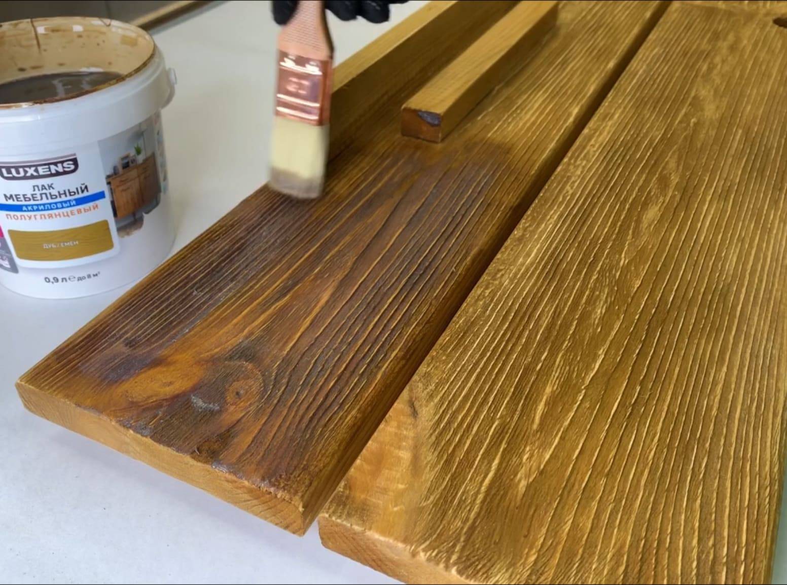 Финальный этап — покрытие готовой полочки мебельным лаком. Небольшой совет: если вы хотите, чтобы борозды на дереве выглядели чуть более контрастно, перед нанесением лака пройдитесь по поверхности шлифовальным наждачным листом — он снимет излишки морилки, подчеркнув красоту дерева. После лакировки дайте изделию высохнуть, время указано на упаковке лака. Уютная и вместительная полочка для ванной — готова!