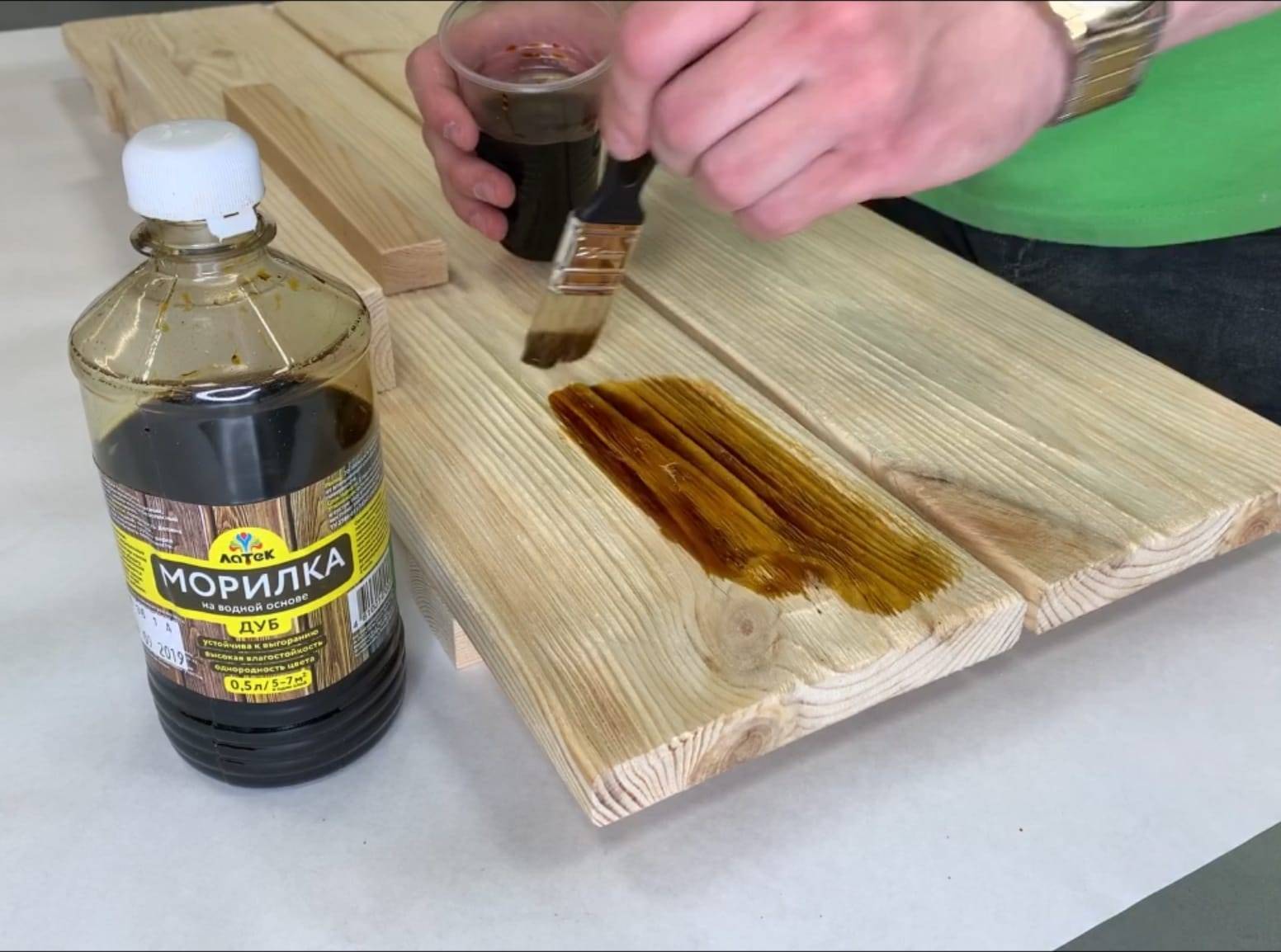 Покройте почти готовую полочку мебельной морилкой: в нашем примере это морилка «дуб», но вы можете выбрать какой-то другой цвет, например, исходя из интерьера ванной. Дайте морилке высохнуть в соответствии с инструкцией к ней.