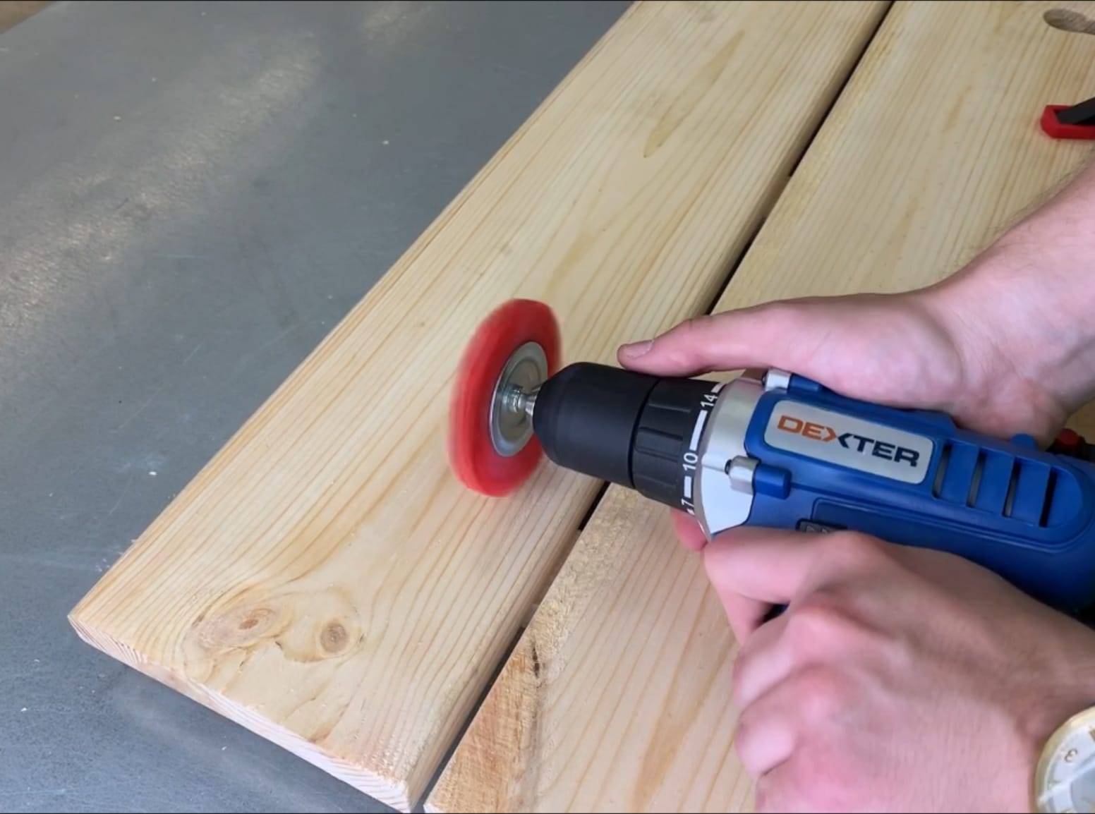 Обработайте столешницу будущей полки дрелью с насадкой-щёткой из металла, а затем — с насадкой-щёткой из нейлона. Пройдитесь аккуратно и без сильного нажима вдоль древесного волокна по всей поверхности столешницы. Более жёсткая металлическая насадка подчеркнёт естественные борозды на дереве и сделает поверхность эффектно неровной. Более мягкая нейлоновая насадка смягчит возможные резкие контуры. Затем пройдитесь наждачной бумагой по поверхности, удалив микрозанозы и заусенцы.