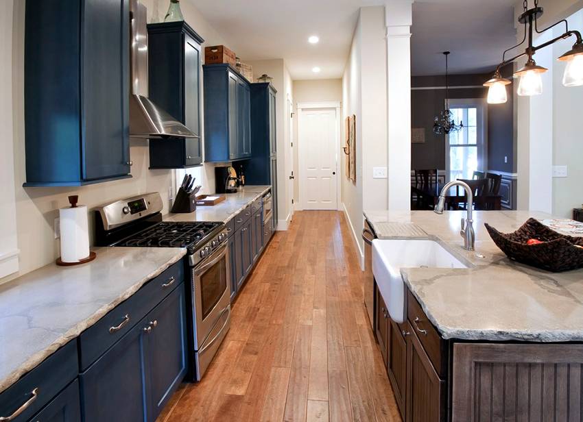 Самый экономичный материал столешницы — ламинат. Материал легкий, не требует особого ухода и очень прочный. Жирные пятна и липкие продукты легко оттираются с поверхности, что делает ламинированные столешницы разумным выбором для занятых людей.