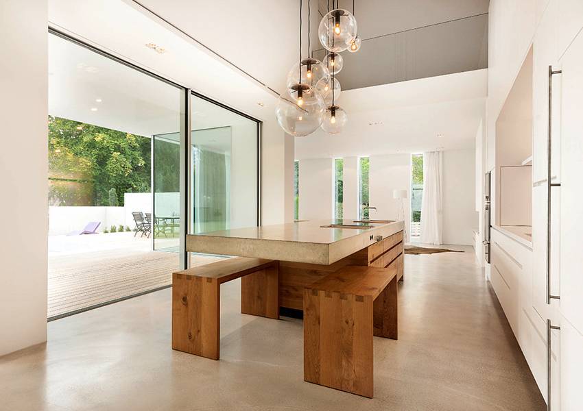 Стандартным деревянным необработанным столом на четырех ножках можно гармонично разбавить ультрасовременный дизайн, придав ему домашнего уюта. Для этого просто необходимо заранее положить на пол ламинат или линолеум под натуральное дерево. Этого будет достаточно, чтобы мебель не выбивалась из общей картины.