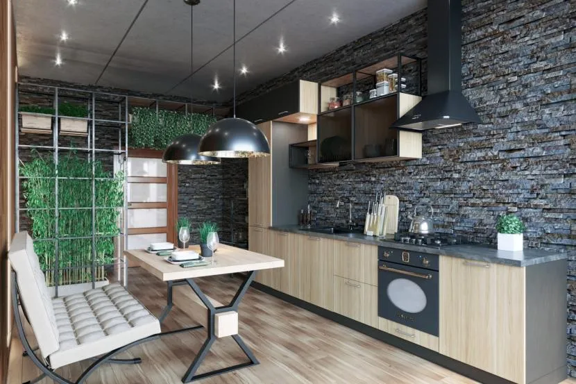Лофт. В оформлении обеденной зоны на кухне в промышленном стиле не обойтись без мебели аскетичной формы с металлическим каркасом. Столешницу лучше выбирать деревянную; хорошо, если она сделана из цельного среза (слэба). Стулья могут быть разными по исполнению; их может дополнить кожаный диванчик.