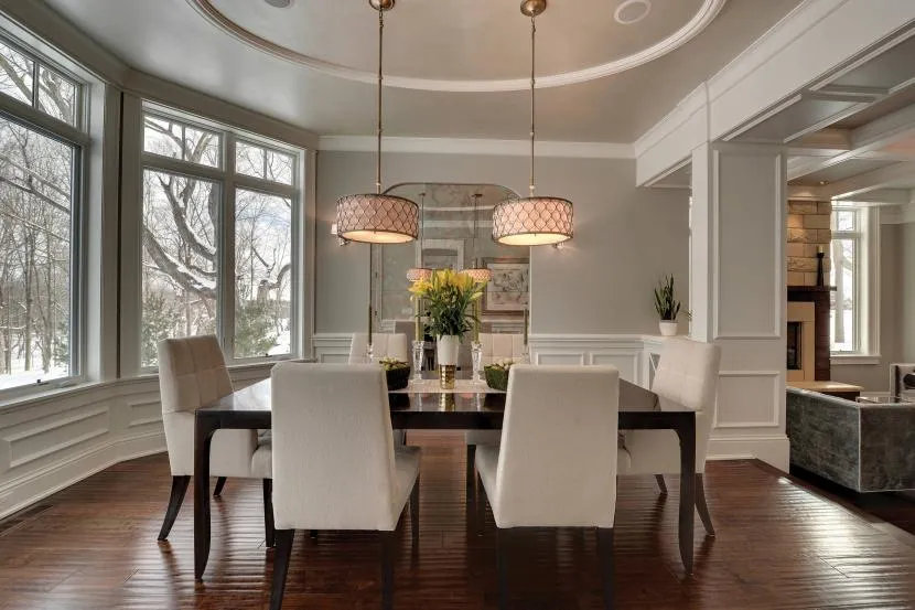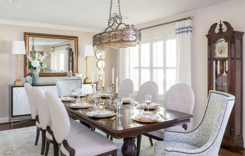 Классический стиль. Подойдёт мебель чётких геометрических форм и нейтральных оттенков. Любители эклектики могут попробовать сочетание разных направлений. Например, классический стол дополнят стулья в стиле ар-деко контрастной расцветки. Иногда достаточно выразительной детали: один из стульев с мягкой спинкой можно заменить креслом с обивкой капитоне.