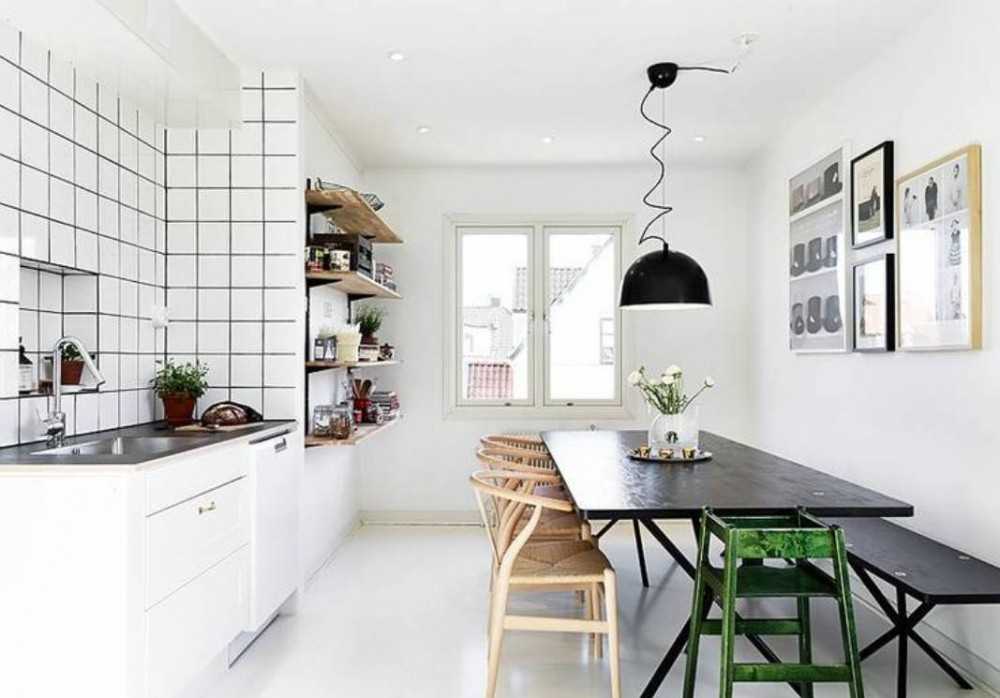 Использование табуретов или стульев без спинки поможет сэкономить пространство, так как их легко можно задвинуть под стол после трапезы.