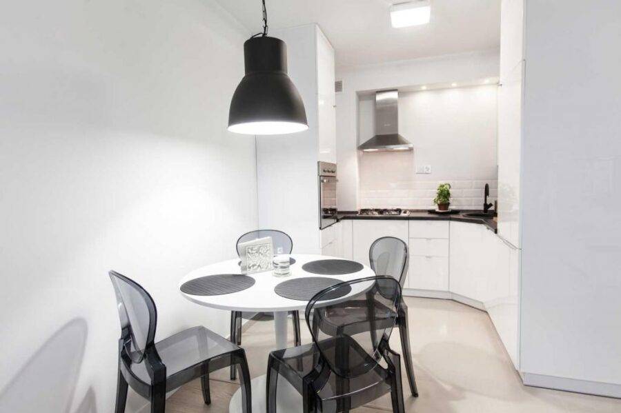 Прозрачные модели прекрасно смотрятся в маленькой комнате. Они не нагружают интерьер, и у окружающих не появляется ощущение, что кухня перегружена мебелью. Для таких стульев подходит стол из стекла или пластика. Альтернатива – столешница из МДФ, покрытая слоем эмали или пленкой ПВХ.