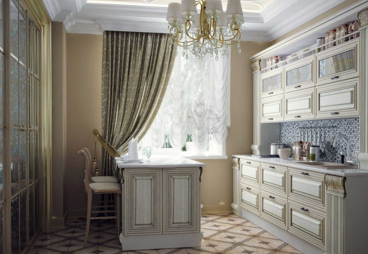 Классика отличается спокойными драпировками, без вычурных украшений. Если шторы закрепляются кольцами или заколками, материал держателей должен сочетаться с фурнитурой кухонного гарнитура.