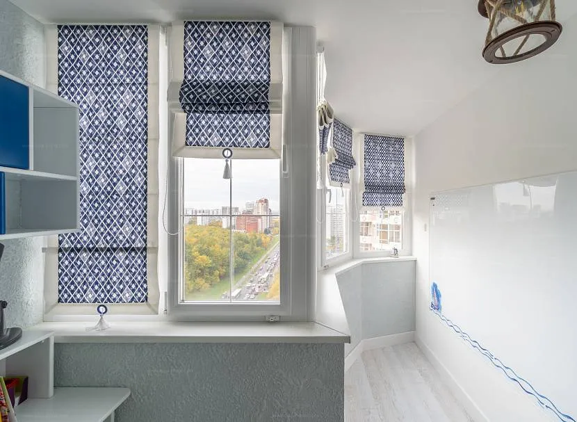 Найдено оптимальное решение – трехскладчатые секции римских штор размещены повыше, чтобы не занимать полезное пространство лоджии Источник aura-home.com