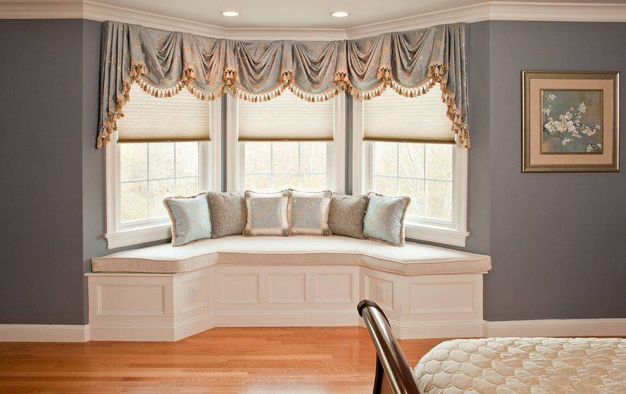 Выбор оформления эркерного окна не подчиняется каким-то особым правилам, и все зависит от общего облика помещения. Можно экспериментировать, сочетать разные цвета, плотности, фактуры.