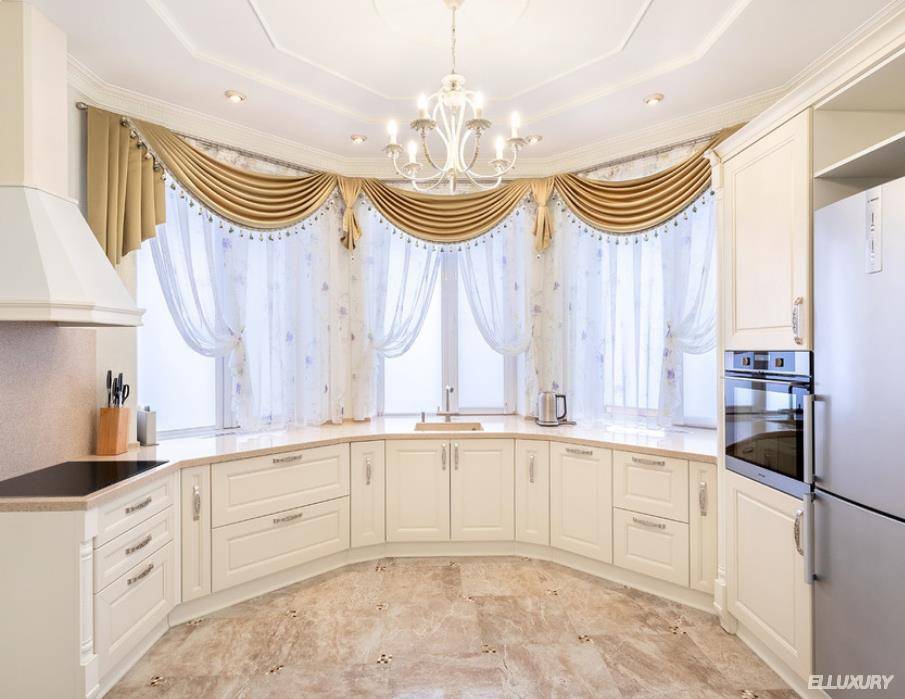 Кухня с эркером – это настоящая находка. Ведь на кухне всегда так не хватает места. Эркер послужит обеденной зоной. Основные требования, предъявляемые к занавескам в кухне: