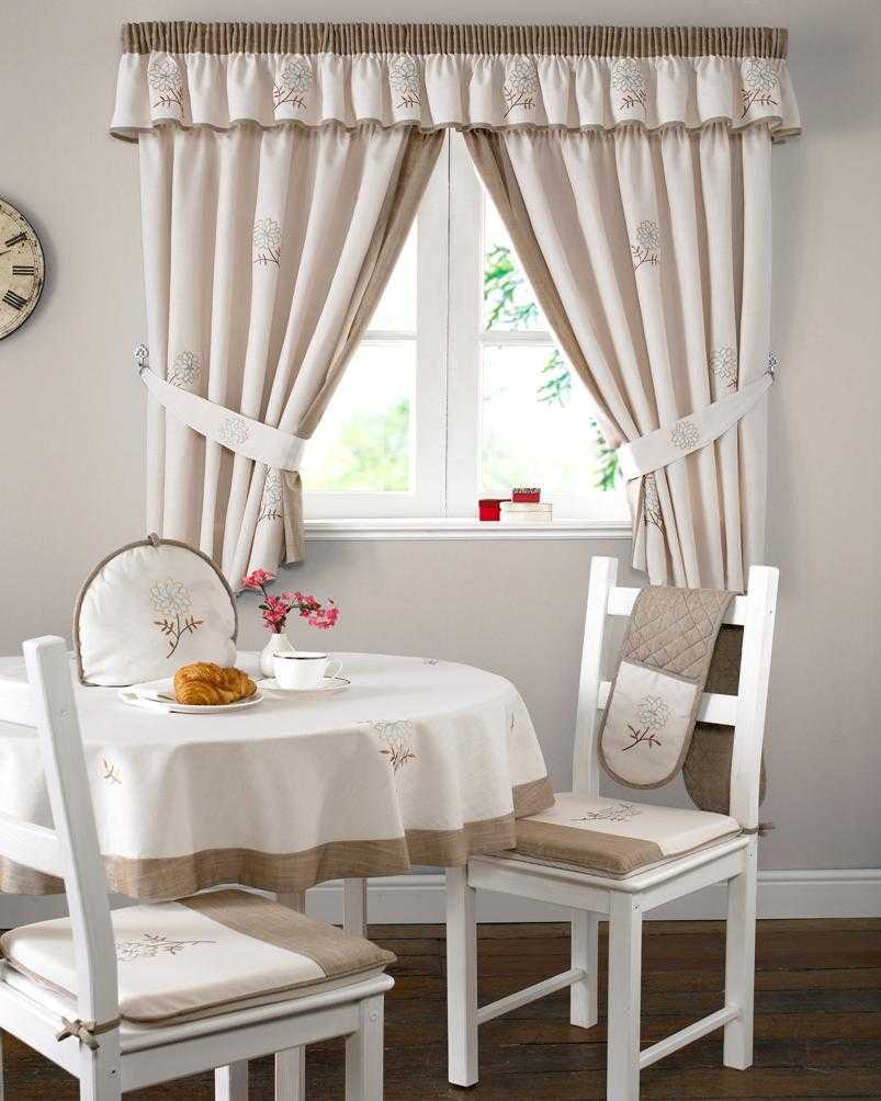 Для занавесей на кухню в стиле прованс можно выбрать однотонное светлое полотно и украсить его оборками и подхватами с орнаментом, подходящим к остальной обстановке помещения.