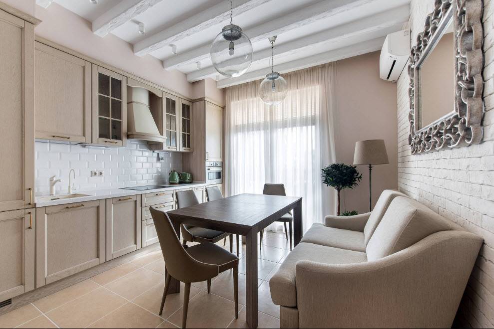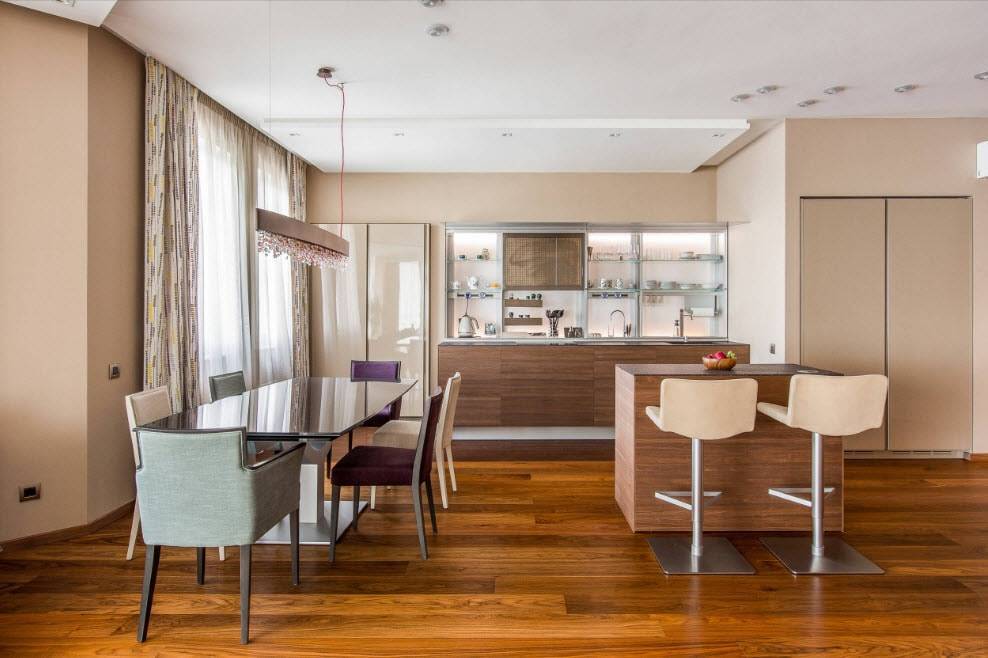 Длинные плотные шторы с тюлем или без него отлично смотрятся в кухне-гостиной.