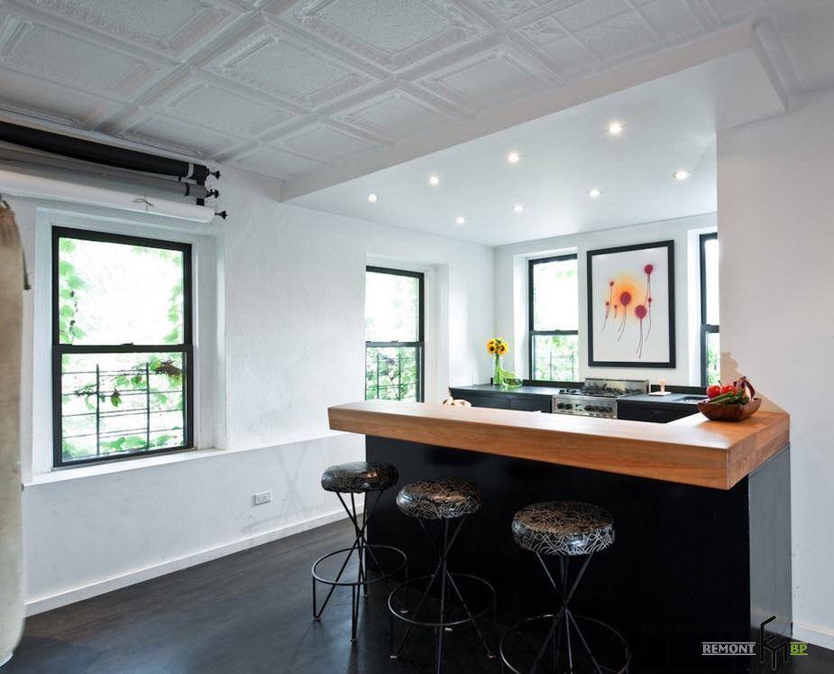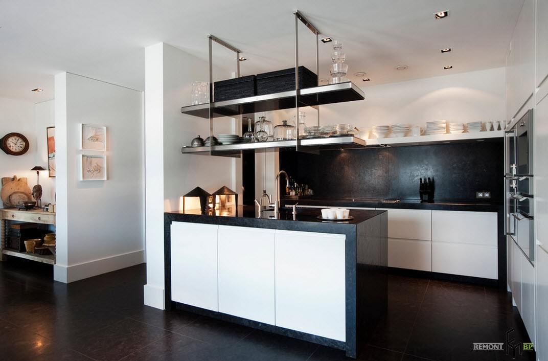 На потолке, который допустимо сделать глянцево-черным, присутствует несколько точечных светильников, над столешницами, одна из которых – островная, размещают лампу на длинном шнурке.