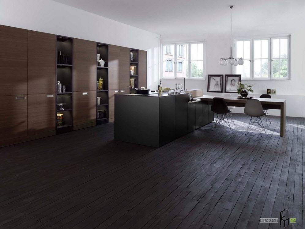 Черный пол придает помещению респектабельность. Независимо от наполненности мебелью, кухня будет выглядеть насыщенно, без ощущения пустоты. И с точки зрения психологии, такой дизайн очень комфортным для человека, поскольку создает чувство приземленности и надежности. В кухне не нужны дополнительные акценты – эту миссию берет на себя пол.
