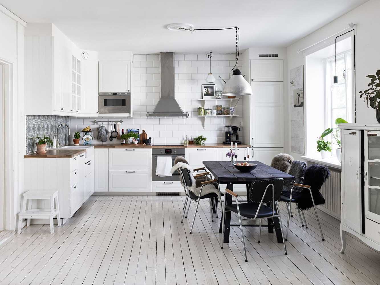 Именно для скандинавского стиля дизайн черно-белой кухни является классическим. Даже дощатый пол скандинавы могут покрасить в белый цвет. На фото представлен дизайн, который сочетает в себе некоторую небрежность и домашний сельский уют. Стыки между досками на полу и блоками на стене нарочито подчеркнуты, создавая эффект старины. Очарования придают старинный декор и аксессуары, стол из мореного дуба и украшенные заклепками стулья. Скандинавские мотивы задают настроение всему помещению. Освещение оформили достаточно оригинально, даже не пытаясь спрятать провода, но это выглядит пикантно и уместно.