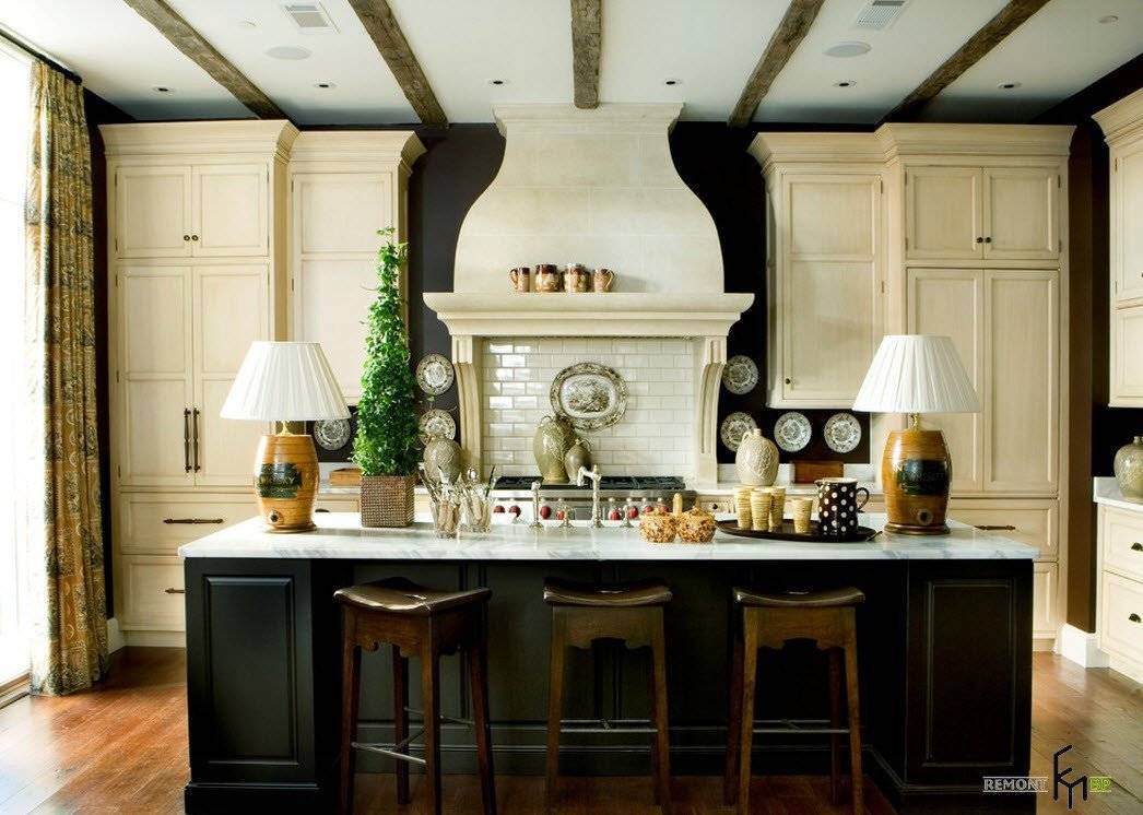 Отдельные любители покрывают одну или все стены кухни черной декоративной штукатуркой, грифельной краской, размещая на таком фоне беленький гарнитур, не имеющий закрытых верхних шкафчиков. Сверху имеются только открытые полки, также окрашенные в темные тона, потому совсем незаметные. Такое оформление хорошо смотрится в П-образной, G-образной кухне, так как немного белого присутствует вдоль всего пространства.