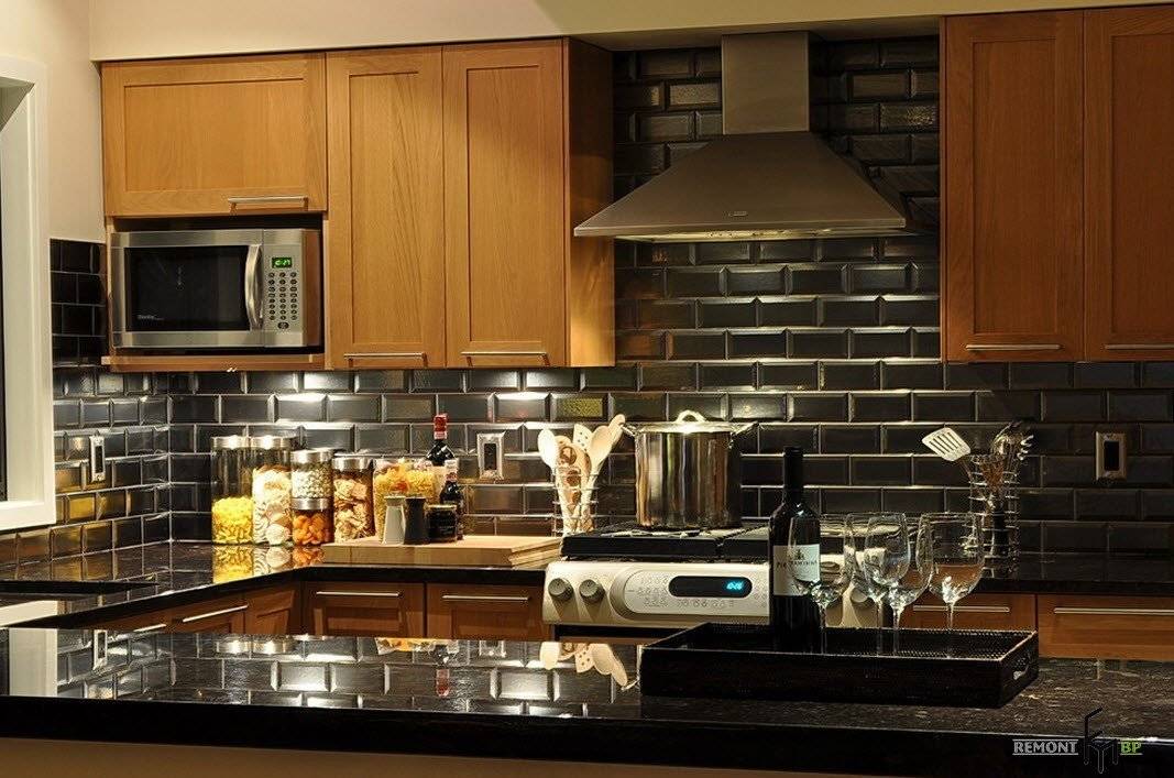Черным цветом можно оформить не только столешницу, но и сам кухонный фартук.