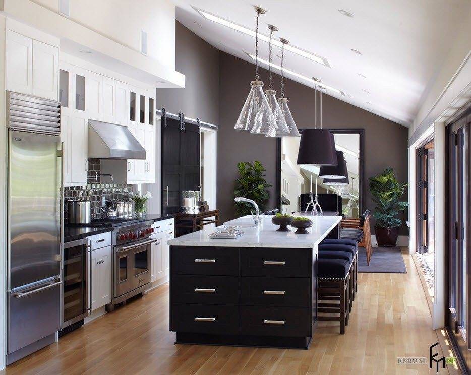 В этой роскошной кухне, изюминкой которой стал скошенный потолок, оформление темными тонами лишь некоторых вертикальных поверхностей создает приятный для взгляда контраст. Комбинированное освещение на нескольких уровнях, изобилие солнечного света позволяет применять черные цвета для декора, меблировки и текстильного оформления кухонного интерьера.