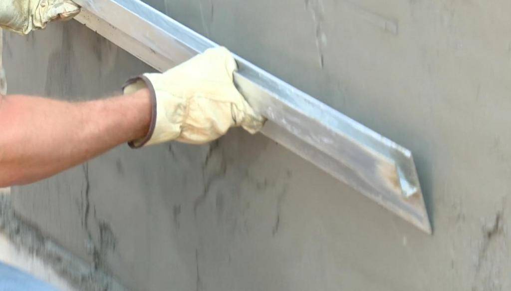 - На бетонную стену наносится меньшее количество раствора, потому что она сама по себе ровная. Для схватывания штукатурки на поверхности бетона делают засечки.