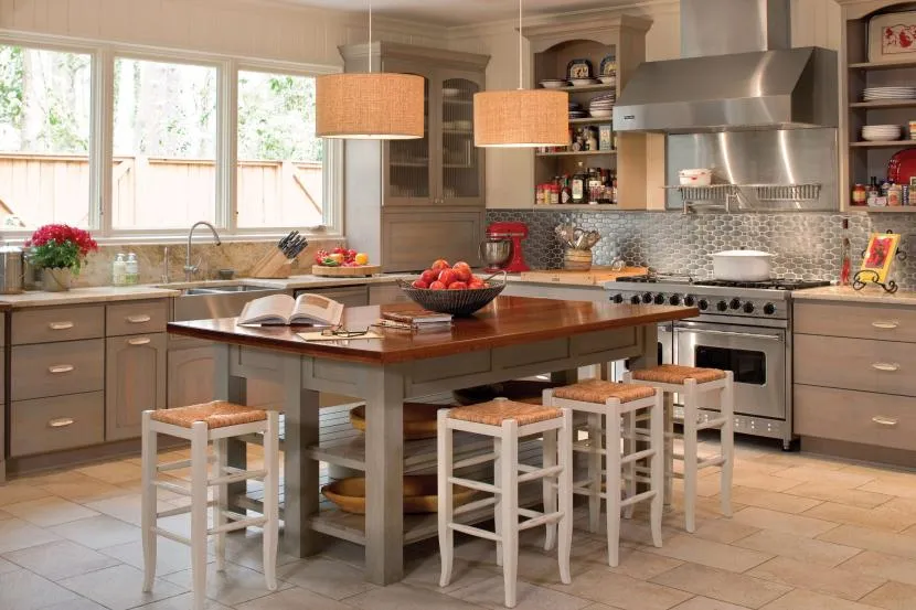 Обладатели просторной кухни могут поставить стол со стульями в центре комнаты. Такое островное расположение идеально с разных точек зрения: оно удобно, так как находится далеко от стен, и безопасно, поскольку плита также отдалена.