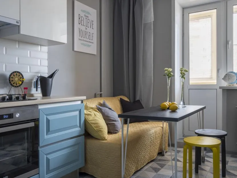 На маленькой кухне значение приобретает многофункциональная мебель: складной или раздвижной стол, диванчик с ёмкостями для хранения, складные стулья или табуреты, которые легко задвинуть под стол.