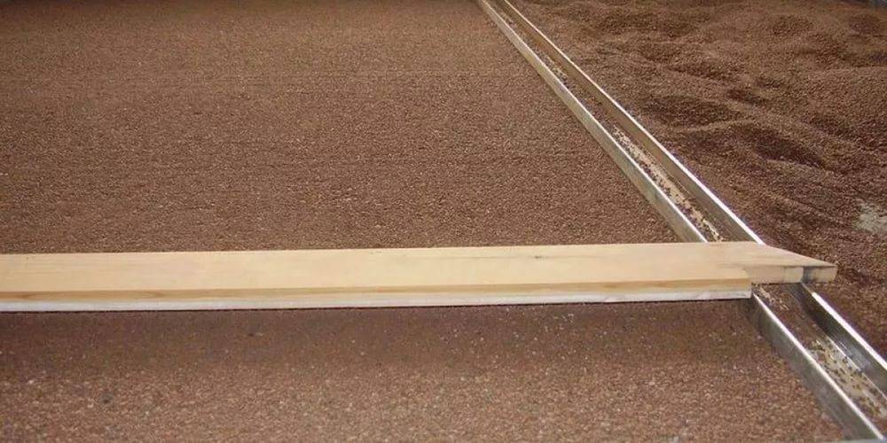 - Пространство между направляющими рейками заполняют керамзитом своими руками. Широким шпателем равномерно распределяют наполнитель.