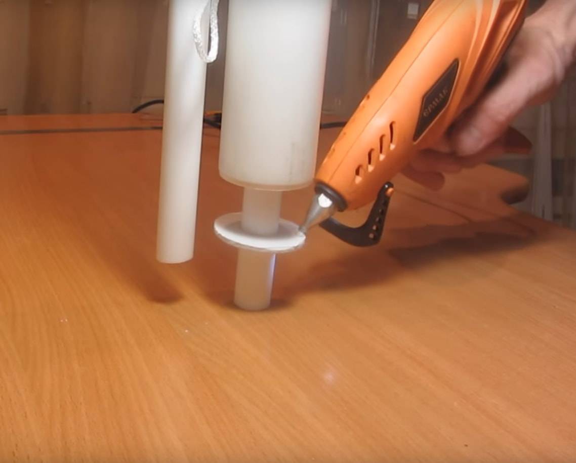 ![]() | Кусок трубы обрезается до нужного размера и на него приклеивается белая крышка. С ней скручивать устройство удобнее. |