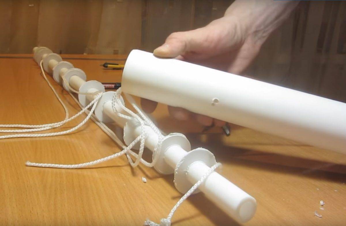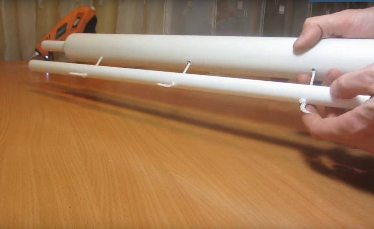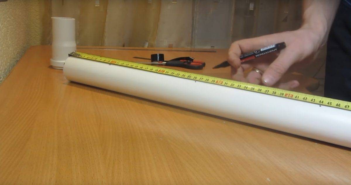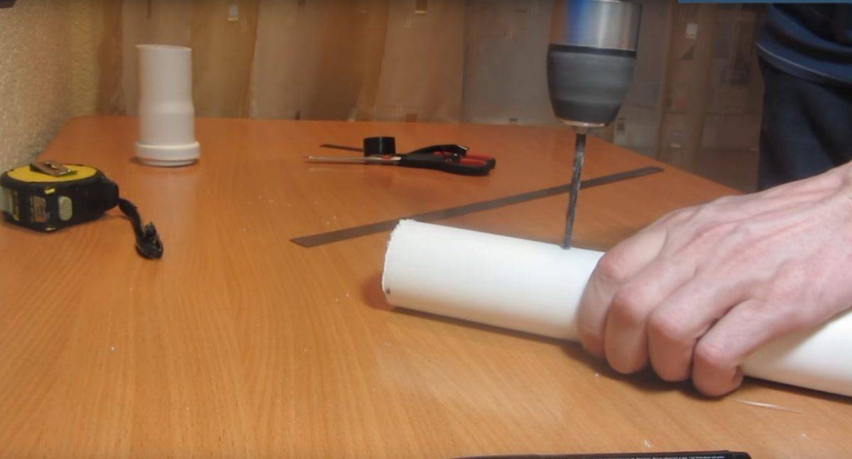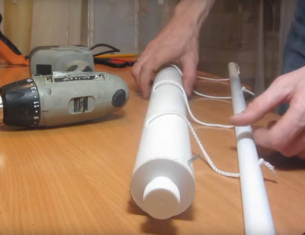 ![]() | Все начинается с подготовки широкой трубы. На ней необходимо отметить четыре отверстия для шнура. |