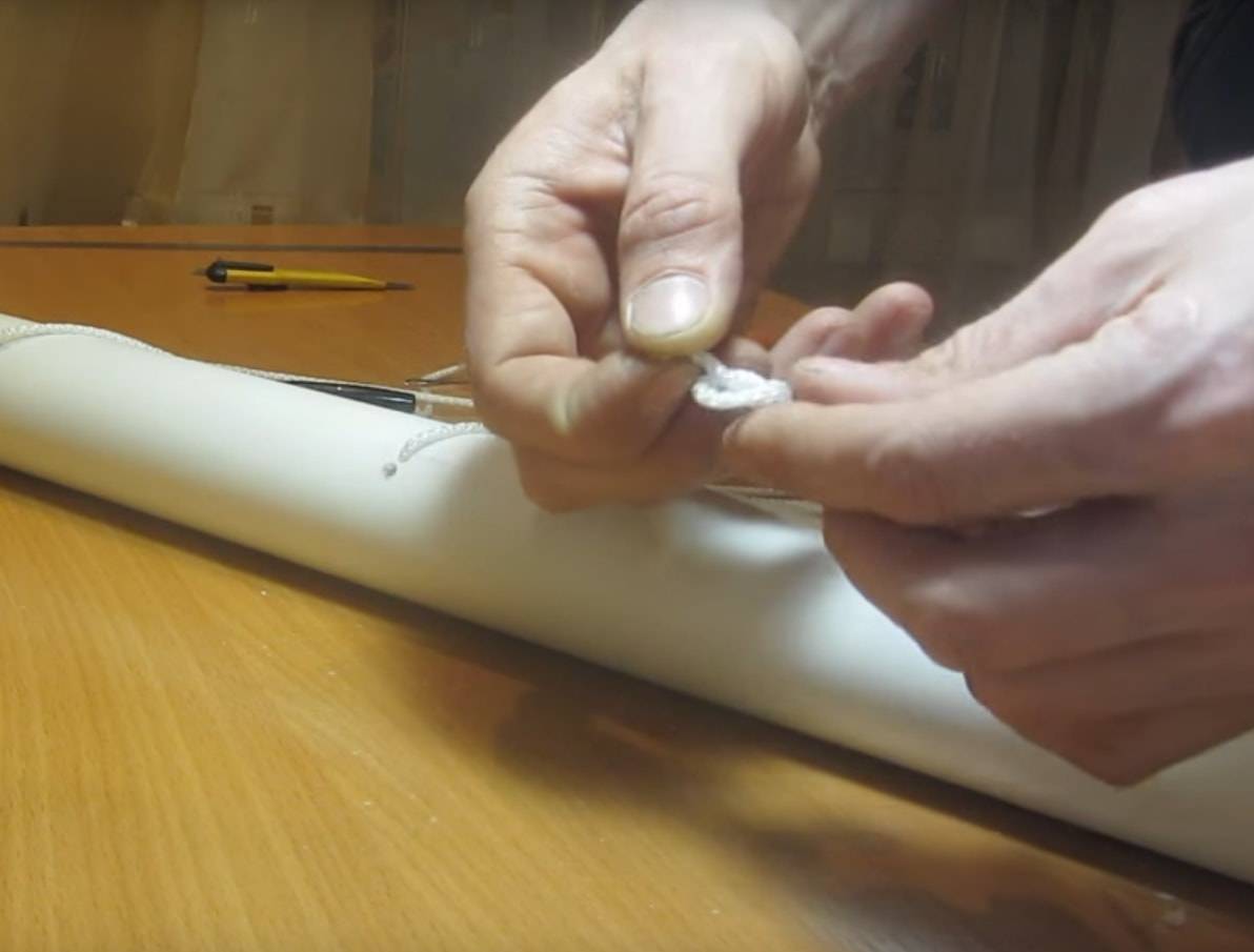 ![]() | Веревки продеваются внутрь конструкции с помощью скрепки или шпильки. |