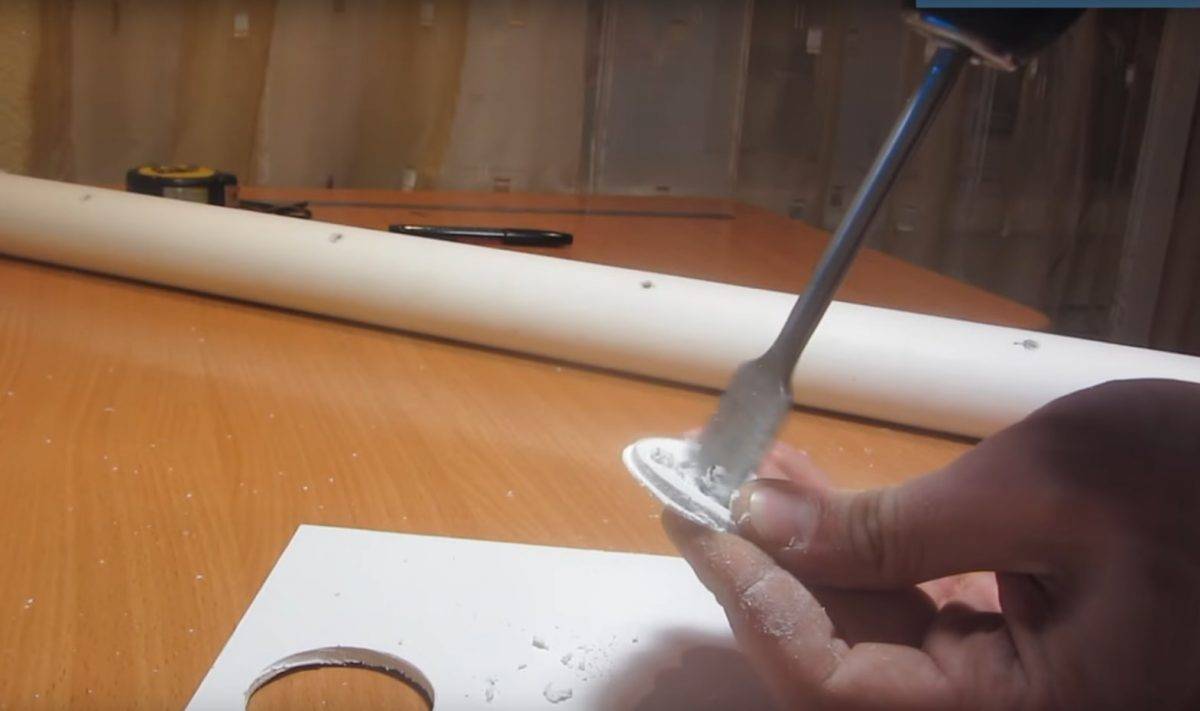![]() | Следующий шаг: отверстия размечаются в малой трубе. Необходимо, чтобы они были напротив отверстий в большой трубе. |