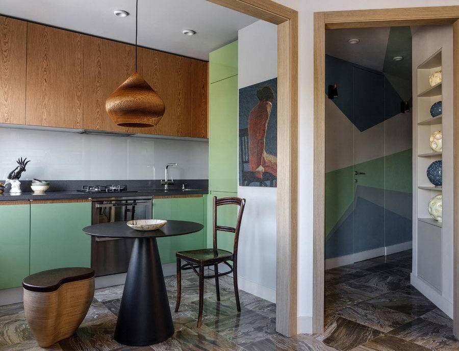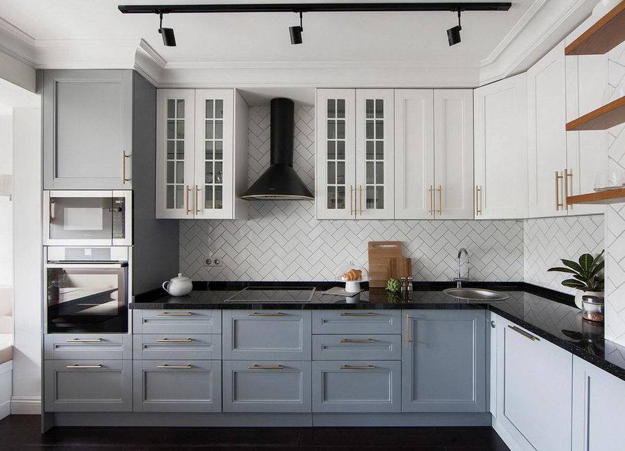 Темные тона в оформлении кухни – это удобно, ведь загрязнений не будет видно, и уборка станет более редким событием. Но также темные расцветки считаются пожирателями пространства, поэтому использовать их лучше дозированно либо компенсировать усиленным освещением.